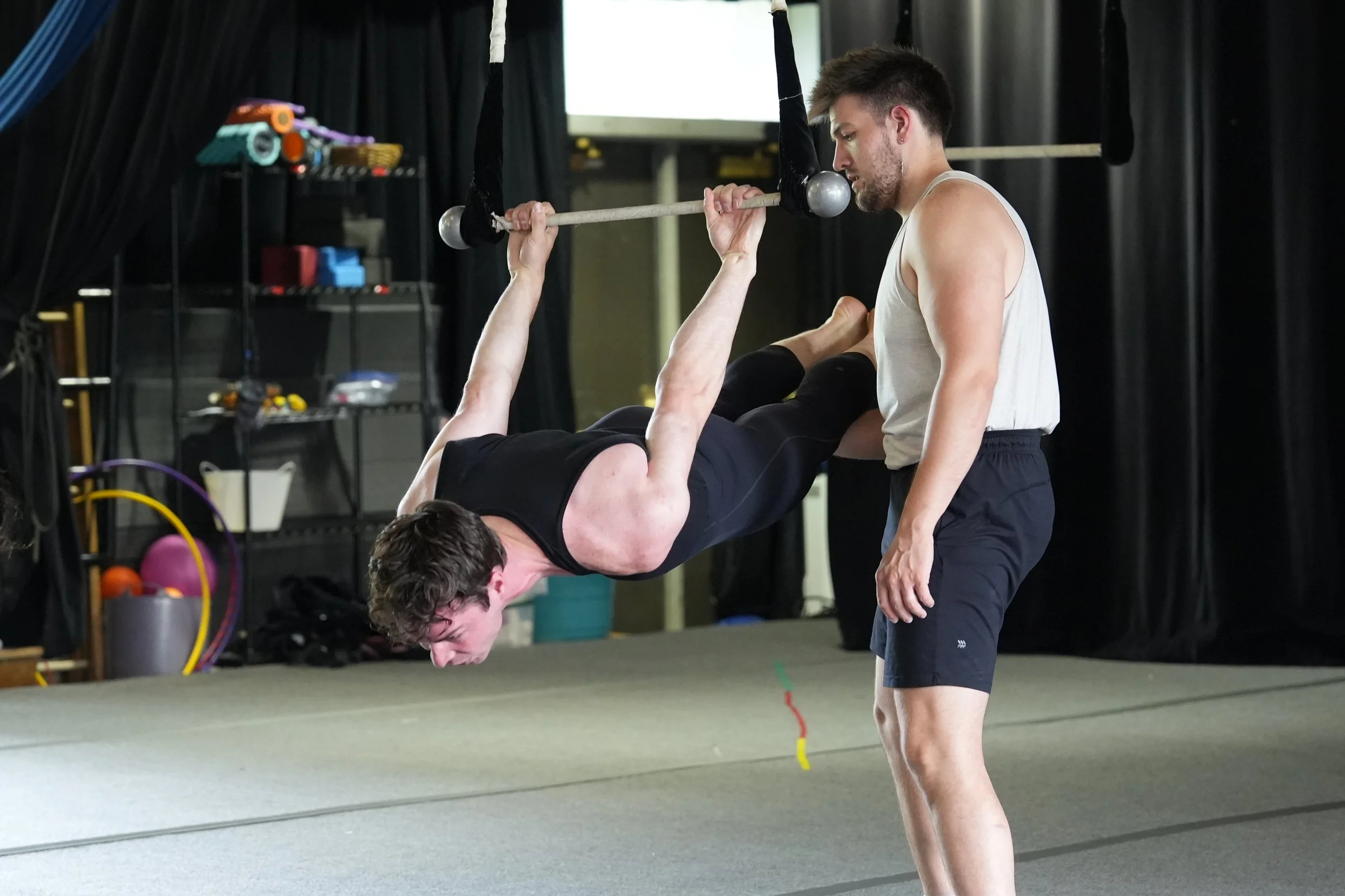 - Trapeze or Lyra (low apparatus): Clean Pullover from floor (no feet on ropes or hoop), 10 Second Hip Balance (no hands)