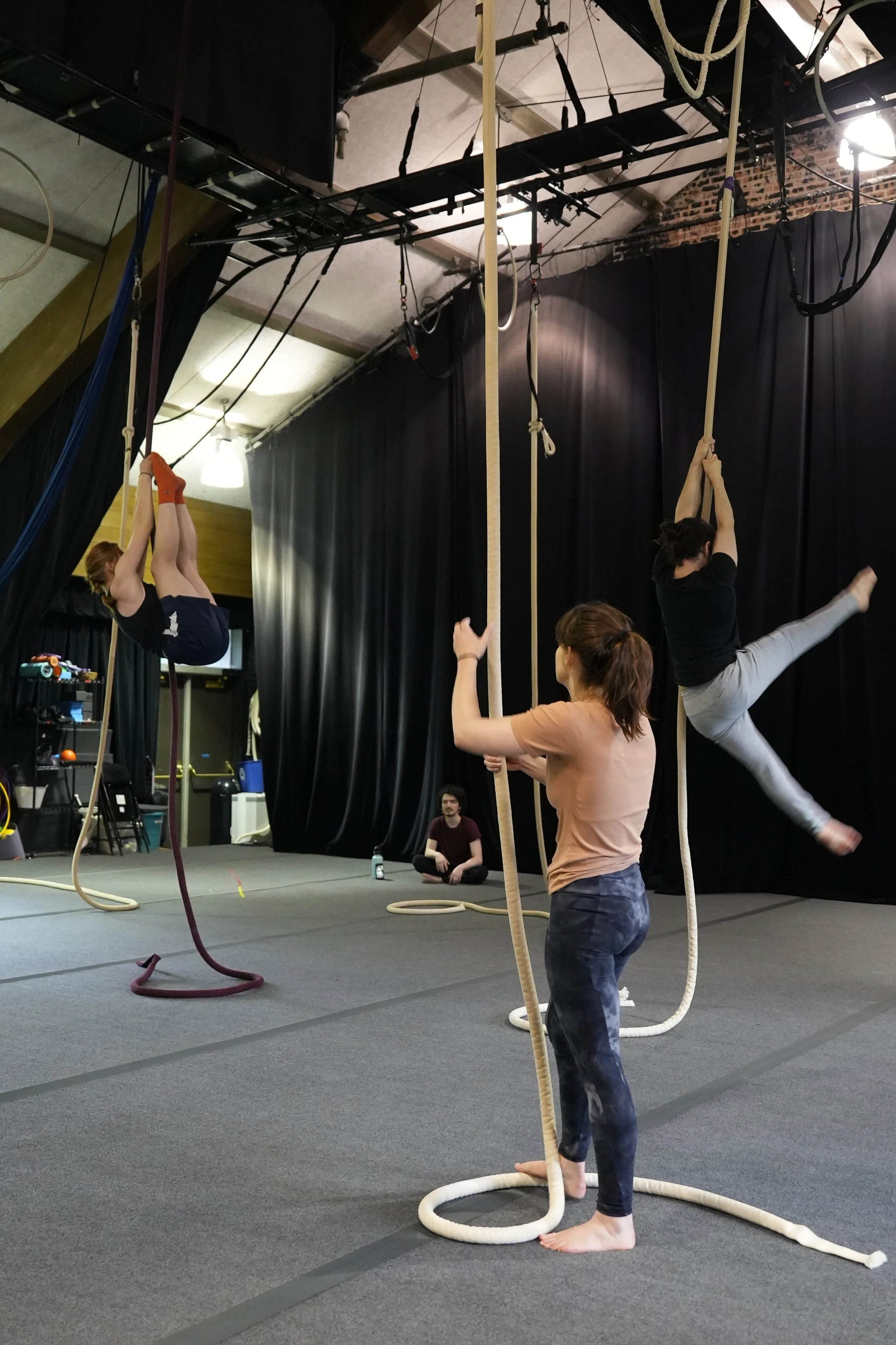 Wednesdays 8:30pm - 10:00pmThis course will focus on movement-based research and weekly creative prompts to create unique and inspired choreography. Through this class the students will create a group act (apparatus will be chosen by the class) culminating in a group act for Circus in Progress on Saturday, December 13th. A basic skill level of trapeze and fabric are required, but it is not necessary to be a master of either apparatus to participate.